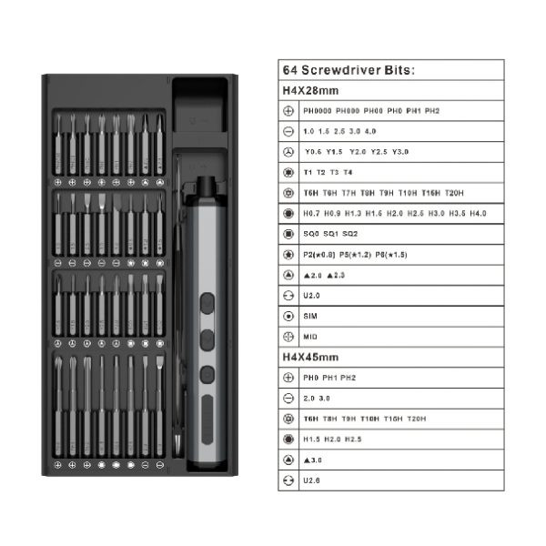 شامل یک دسته پیچ گوشتی برقی و مجموعه ای از سریهای مختلف پیچ گوشتی.