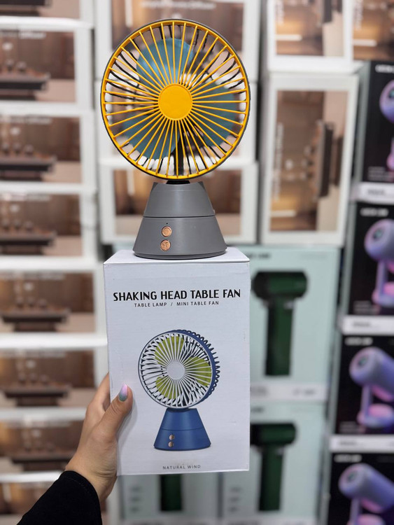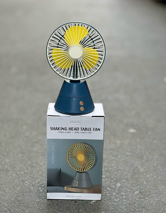 ویژگیها: قابلیت تکان دادن سر (Shaking Head)، عملکرد به عنوان چراغ رومیزی (Table Lamp)، اندازه کوچک و قابل حمل (Mini Table Fan)، و تولید باد طبیعی (Natural Wind)
