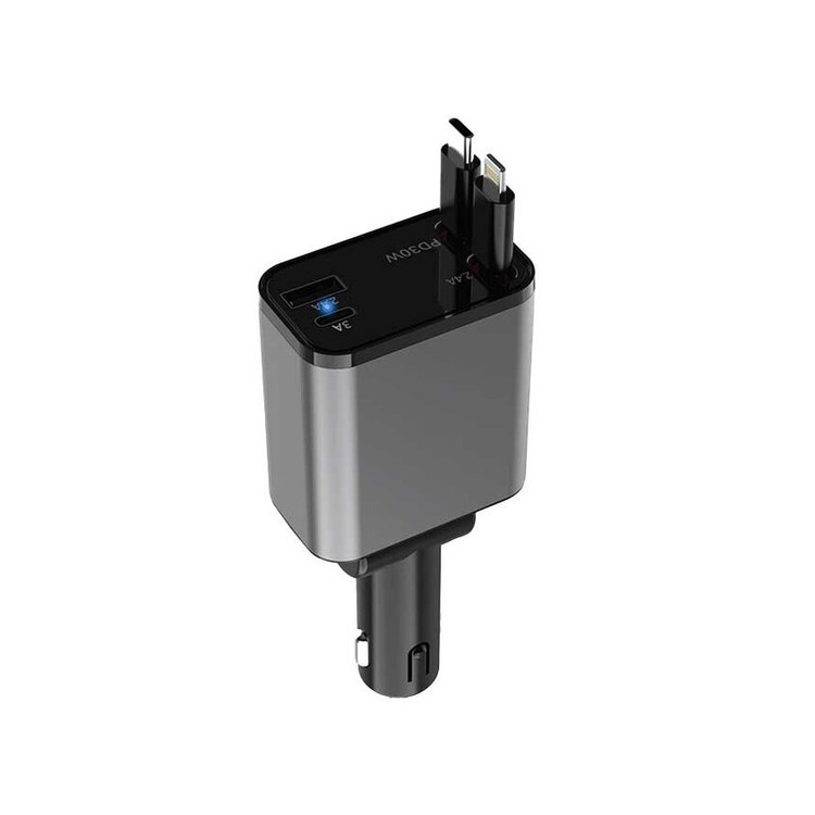 شارژر ماشین جمع شونده 50 واتی رانندگی را بسیار جالب تر می کند. دارای یک کابل Type-c (PD 30W) و یک کابل جمع شونده لایتنینگ است. در صورت خروجی، یک USB-C و یک USB-A دارید. این قابلیت شارژ به این شارژر خودرو اجازه می دهد تا 3 دستگاه را به طور همزمان شارژ کند. برای اطمینان از دوام و استقامت با ABS ساخته شده است. همچنین مجهز به فیوز ایمنی داخلی برای محافظت در برابر جریان بیش از حد و اتصال کوتاه است.
