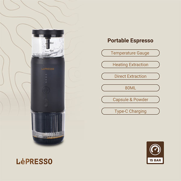 دستگاه اسپرسوساز قابل حمل LePresso راه حلی ایده آل برای دوستداران قهوه است که به اسپرسوی خود در حال حرکت نیاز دارند. با یک مخزن آب 80 میلی لیتری، برای دم کردن یک شات اسپرسو در هر زمان و هر مکان عالی است. مجهز به سه باتری 2500 میلی آمپر ساعتی، می تواند تا 200 اسپرسو با استفاده از آب از قبل گرم شده یا حداکثر 5 اسپرسو با آب سرد یا دمای اتاق تولید کند. این دستگاه از طریق درگاه Type-C با ورودی 5 ولت/3 آمپر به سرعت شارژ می شود و انرژی 135 وات برای قهوه ای قوی و خوش طعم ارائه می دهد. فشار استخراج 15 بار آن تضمین می کند که هر شات غنی و پر طعم است. ساخته شده از فولاد ضد زنگ درجه مواد غذایی، برای استفاده طولانی مدت بادوام و ایمن است. این دستگاه همچنین با غلاف نسپرسو و پودر قهوه سازگار است و انعطاف پذیری را برای ترجیحات قهوه شما ارائه می دهد.