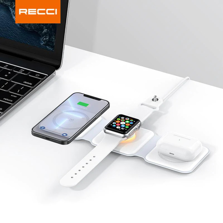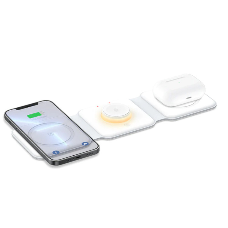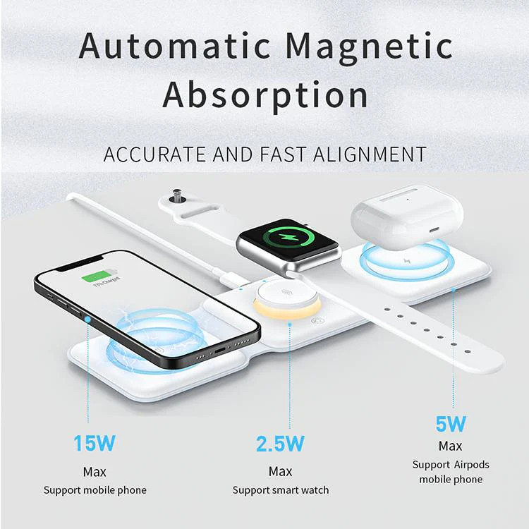 با شارژر بیسیم سهکاره جدید، از شلوغی کابلها خداحافظی کنید! این شارژر با طراحی مدرن و عملکرد فوقالعاده، امکان شارژ همزمان گوشی موبایل، ساعت هوشمند و ایرپاد را برای شما فراهم میکند.