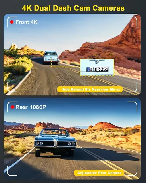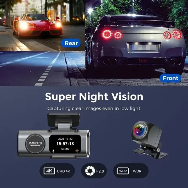 دوربین خودرو دو دوربین 4K وای فای دار دارای دوربین دوم Full HD می باشد. در مقایسه با سایر دستگاه ها که اکثرا دوربین دوم پایین تری دارند این دوربین خودرو دست بالاتری دارد.