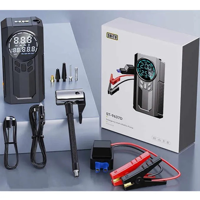 پمپ شارژی و جامپ استارتر خودرو SUITU ST-9637D یکی از جدیدترین و حرفهایترین ابزارهای قابل حمل برای خودرو، دوچرخه، موتورسیکلت و سایر وسایل بادی است. این دستگاه علاوه بر قابلیت تنظیم باد لاستیکها، دارای استارتر اضطراری برای باتری خودرو است که آن را به یک ابزار حیاتی برای رانندگان تبدیل کرده است. طراحی مدرن، نمایشگر دیجیتالی، و امکانات متنوع، این محصول را به گزینهای ایدهآل برای استفاده شخصی و حرفهای تبدیل کرده است. از ویژگی های این محصول می توان به جامپ استارتر خودرو ،پاور بانک، داشتن چراغ قوه ، قابلیت باد کردن لاستیک خودرو ، موتور سیکلت ، دوچرخه ، توپ و... اشاره کرد