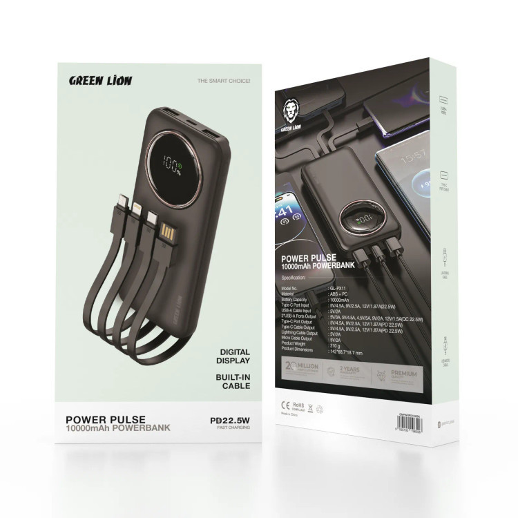 پاوربانک Green Lion Power Pulse 10000mAh وسیلهای سازگار و قابل اعتماد است که از طریق آن میتوان وضعیت شارژ مثبت را در حال حرکت حفظ کرد. این پاوربانک که از ABS و PC ساخته شده است، به اندازه کافی قوی است که تا 10000 میلیآمپر ساعت ظرفیت باتری واقعی را ارائه دهد.این پاوربانک که به تعدادی گزینه ورودی و خروجی مجهز است، از شارژ سریع از طریق پورت Type-C و کابل – PD 22.5W و پورتهای USB-A – QC 22.5W پشتیبانی میکند تا انعطافپذیری را برای دستگاههای مختلف فراهم کند. علاوه بر این، دارای کابلهای لایتنینگ و میکرو داخلی است تا طیف وسیعی از نیازهای شارژ را برآورده کند. صفحه نمایش دیجیتال روی پاوربانک شما را از میزان باتری باقی مانده مطلع میکند، در حالی که کابلهای داخلی راحتی را افزایش میدهند، زیرا نیازی به حمل لوازم جانبی اضافی نیست. با قابلیت شارژ سریع 22.5W، قرار است به طور موثر برق را تحویل دهد و برای تلفنهای هوشمند، تبلتها و سایر دستگاههای دارای USB عالی است. Green Lion Power Pulse یک همراه شارژ قابل حمل نهایی است که از نظر طراحی جمع و جور و با ویژگیهای پیشرفته است.