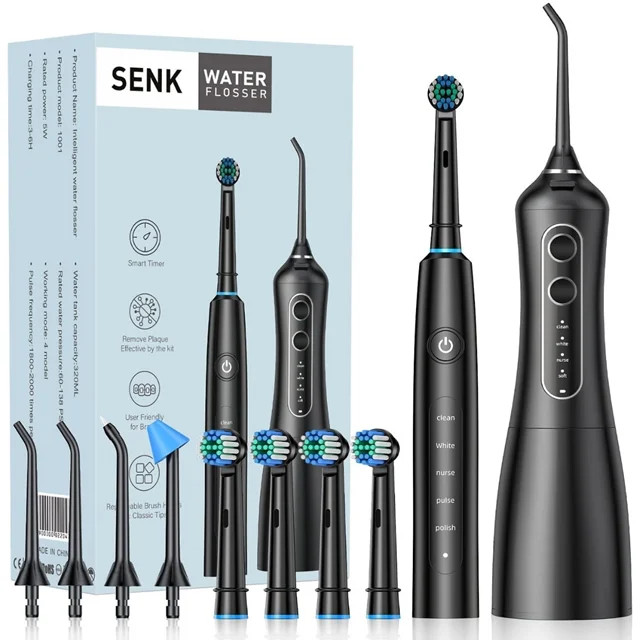 کیت مسواک برقی و نخ دندان هوشمند SENK مدل ۲ در ۱ – مخزن جداشدنی با ظرفیت بزرگ ۳۲۰ میلیلیتر، ۴ حالت، پالس فرکانس بالا ۱۸۰۰-۲۰۰۰ در دقیقه، باتری ۱ هفتهای، سر مسواکهای نایلونی نرم، ۴ نازل، تایمر هوشمند، تمیز کردن عمیق دهان برای از بین بردن پلاک، مناسب برای ارتودنسی، دستگاه شستشوی قابل شارژ USB قابل حمل – ایدهآل برای خانه، مسافرت و هدیه برای زوجها/تعطیلات