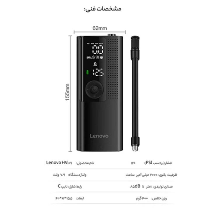 پمپ باد لنوو HV09 قادر است فشار هوا را به راحتی تا 120 PSI (پوند بر اینچ مربع) برساند. این ویژگی به آن امکان میدهد تا به سرعت و به طور مؤثر تایرها را باد کند، به ویژه در مواقعی که به فشار مناسب برای ایمنی و عملکرد بهتر نیاز است.