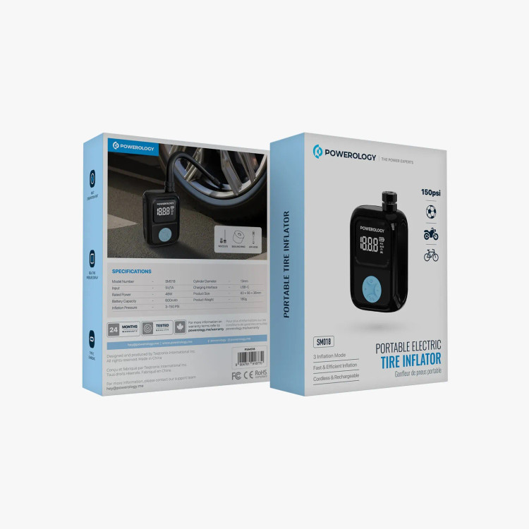 پمپ باد برقی قابل حمل Powerology ابزاری کاربردی است که در کمترین زمان تایرها را باد میکند. این دستگاه دارای یک موتور ۴۸ واتی و ظرفیت باتری ۶۰۰ میلیآمپر ساعت است. میتواند تایرها را از ۳ تا ۱۵۰ PSI باد کند. سیلندر ۱۳ میلیمتری آن جریان هوای قوی و ثابتی را به تایرها منتقل میکند.