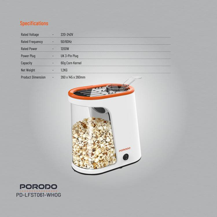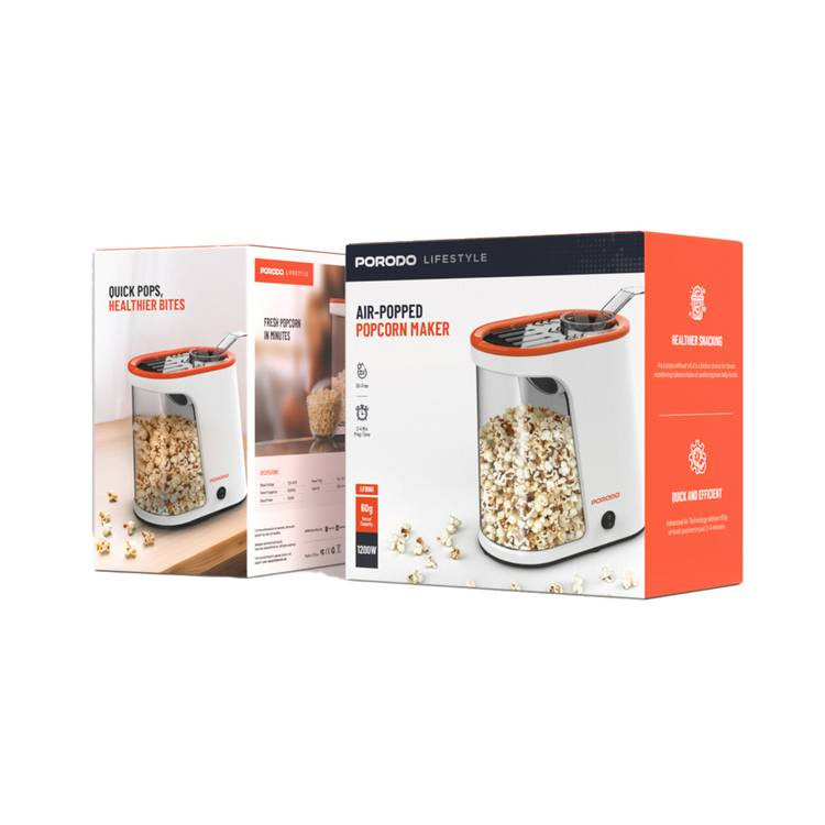 با پاپ کورن ساز Porodo Lifestyle که با تولید پاپ کورن سریع و پربازده در کمترین زمان ممکن است، تجربه میان وعده های سالم تر و بدون نگرانی را داشته باشید. این دستگاه پاپ کورن با ولتاژ کارآمد ۱۲۰۰ وات ۲۲۰ تا ۲۴۰ ولت، فرکانس: ۵۰/۶۰ هرتز تغذیه میشود تا رژیم میانوعدههای روزانه شما را حفظ کند.