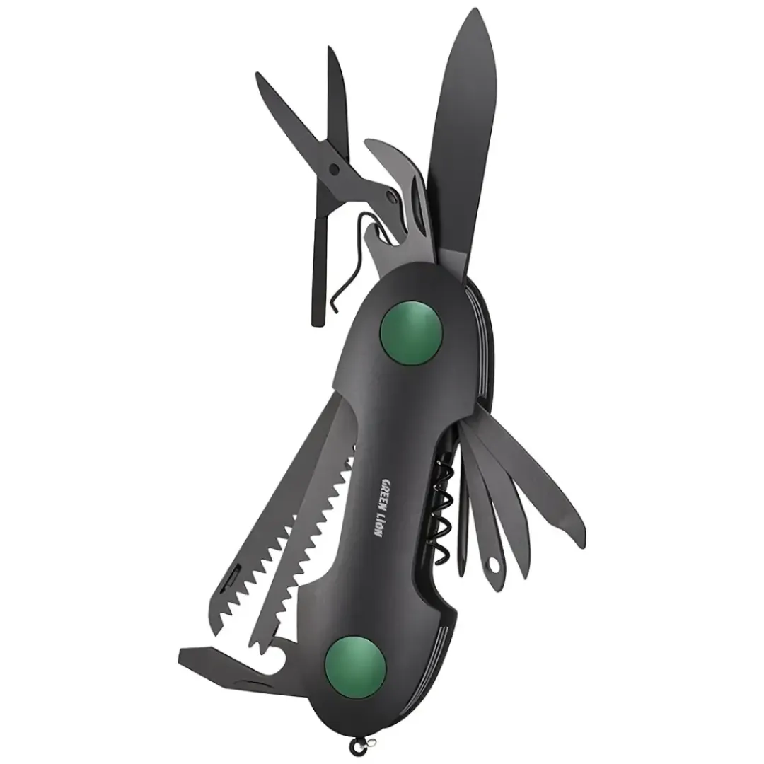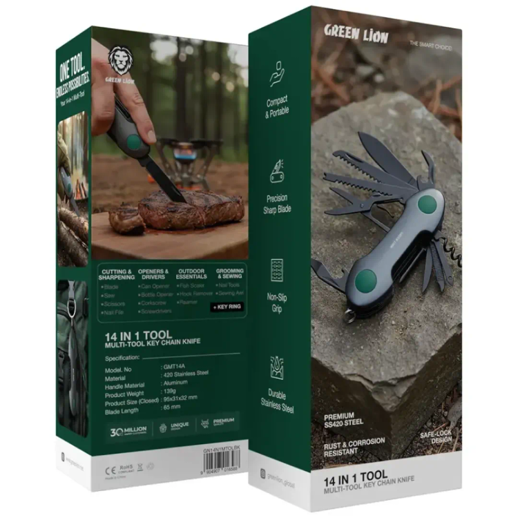 چاقو و ابزار 14 کاره گرین لاین مدل Multi Tool ابزاری همهفنحریف و جمع و جور برای روزمره مانند: «تعمیرات جزئی و جزئی از کیت لوازم اضطراری» و فضای باز مانند: «سفر و کمپینگ» است. این ابزار با دسته آلومینیومی چسبندگی مناسبی را ارائه داده و در دست نمیلغزد. این در حالی است که ابزارهای آن از جنس استیل ضدزنگ 420 بوده و به همین دلیل در برابر زنگزدگی و خوردگی بسیار مقاوم میباشند. چاقو و ابزار 14 کاره گرین لاین مدل Multi Tool شامل 14 ابزار کاربردی شامل: «قیچی، تیغه چاقو (طول ۶۵ میلیمتر)، پیچگوشتی تخت، جاسوییچی، درببازکن بطری، قوطیبازکن، قلاب، قلاب بازکن، ارّه، پولکگیر ماهی، درببازکن بطری، پیچگوشتی چهارسو، یخشکن، تمیزکننده ناخن، سوهان ناخن، سوزن» است. از سایر مشخصات برجسته این محصول میتوان به بهرهمندی آن از «مکانیسم قفل خودکار» برای حفظ ایمنی کاربر اشاره کرد.
